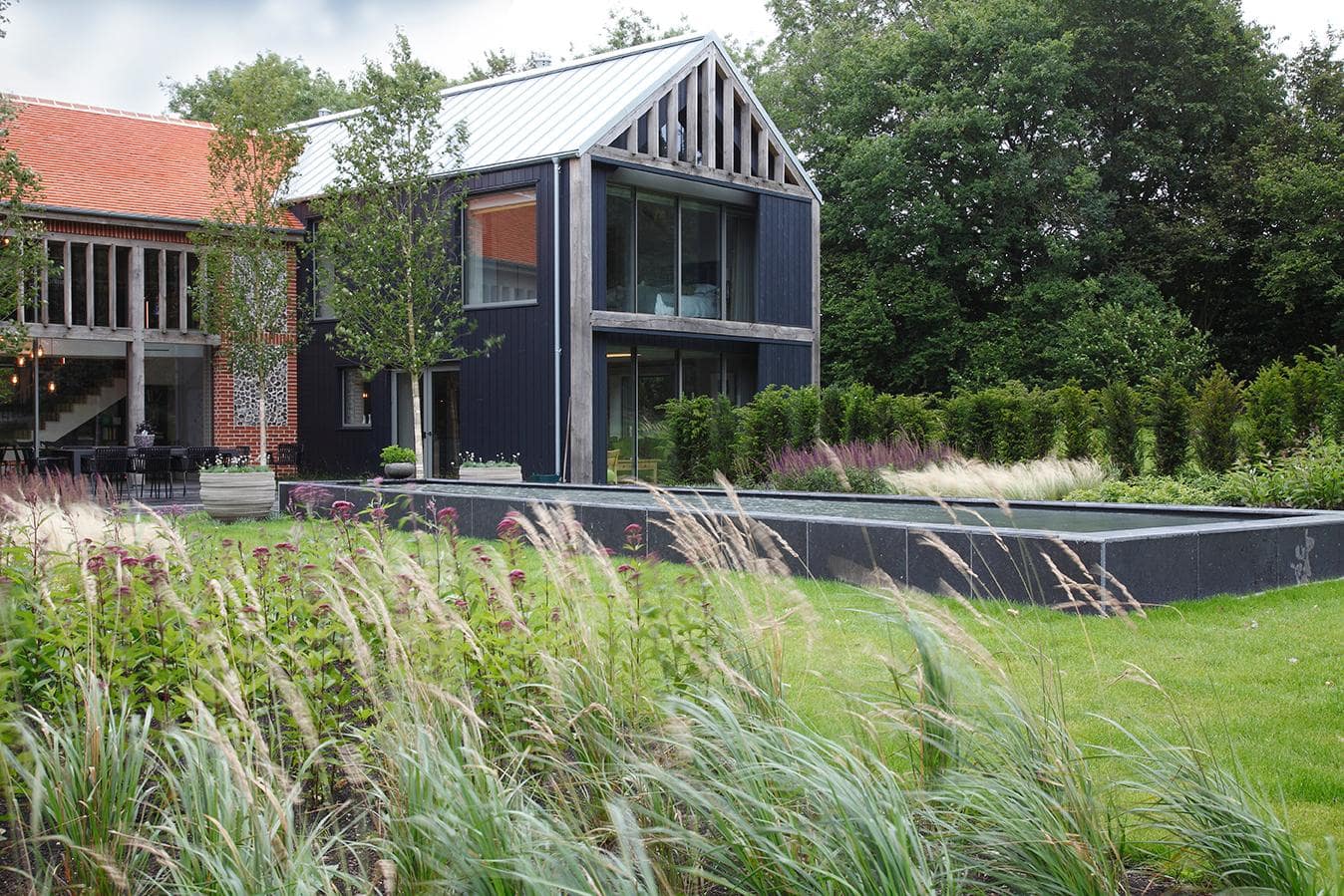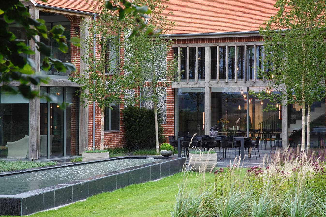 Hard Works - Limestone paving, composite decking, raised planters, reflection pool.